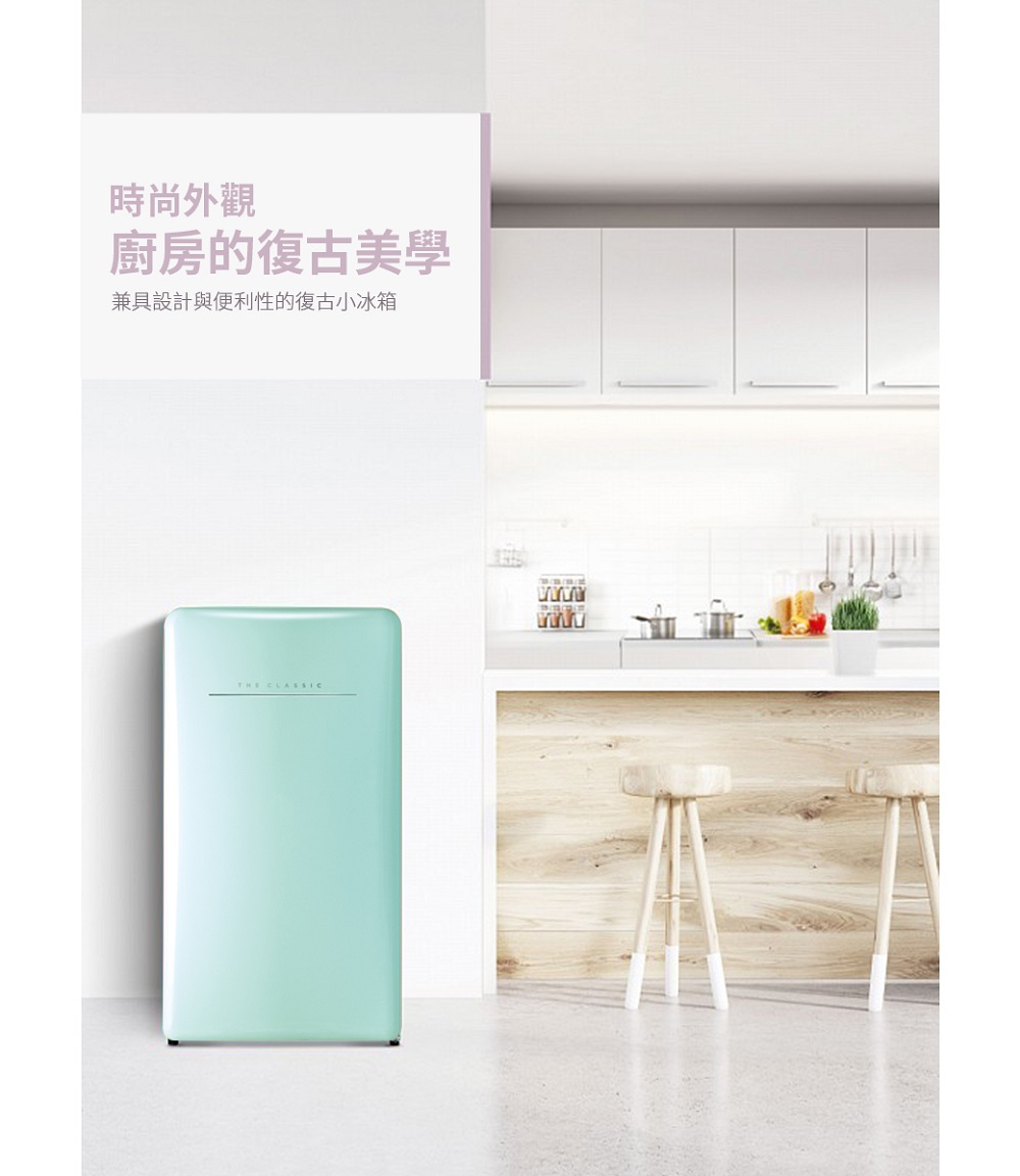歐式復古無霜小冰箱,整體造型復古可愛,圓弧一體成型技術,環保耐磨保護漆,前端烤漆工藝光潔度高、時尚大氣。典雅白、薄荷綠兩種配色更可完美搭配家居。