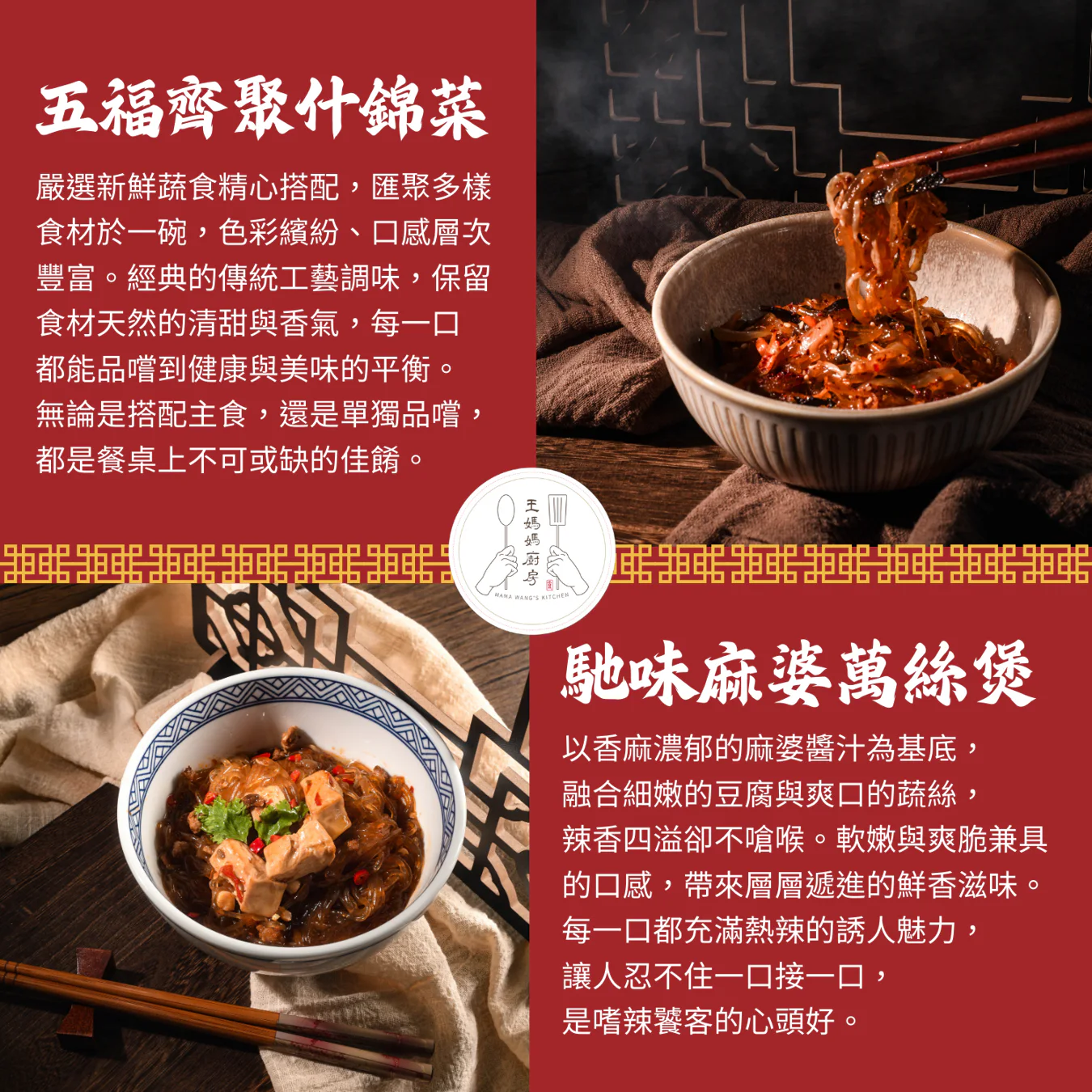 年菜組合包含:招牌佛跳牆、紅燒獅子頭、鮮蝦蒸粉絲、蜜汁烤雞腿、樹子清蒸鱸魚、五福拼盤(滷牛腱、煙燻鴨胸、黃金泡菜、涼拌海蜇、糖醋小卷)、手工蘿蔔糕。主廚嚴選新鮮食材,經典手藝呈現,滿足一家人的味蕾與新年期待。