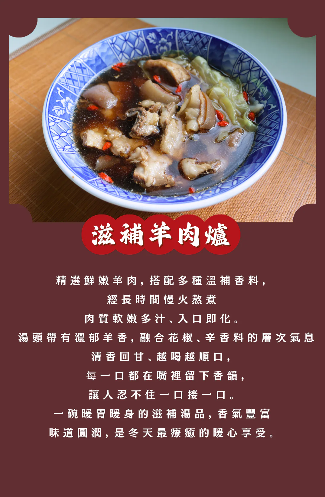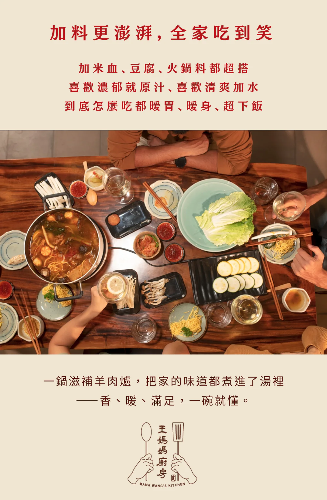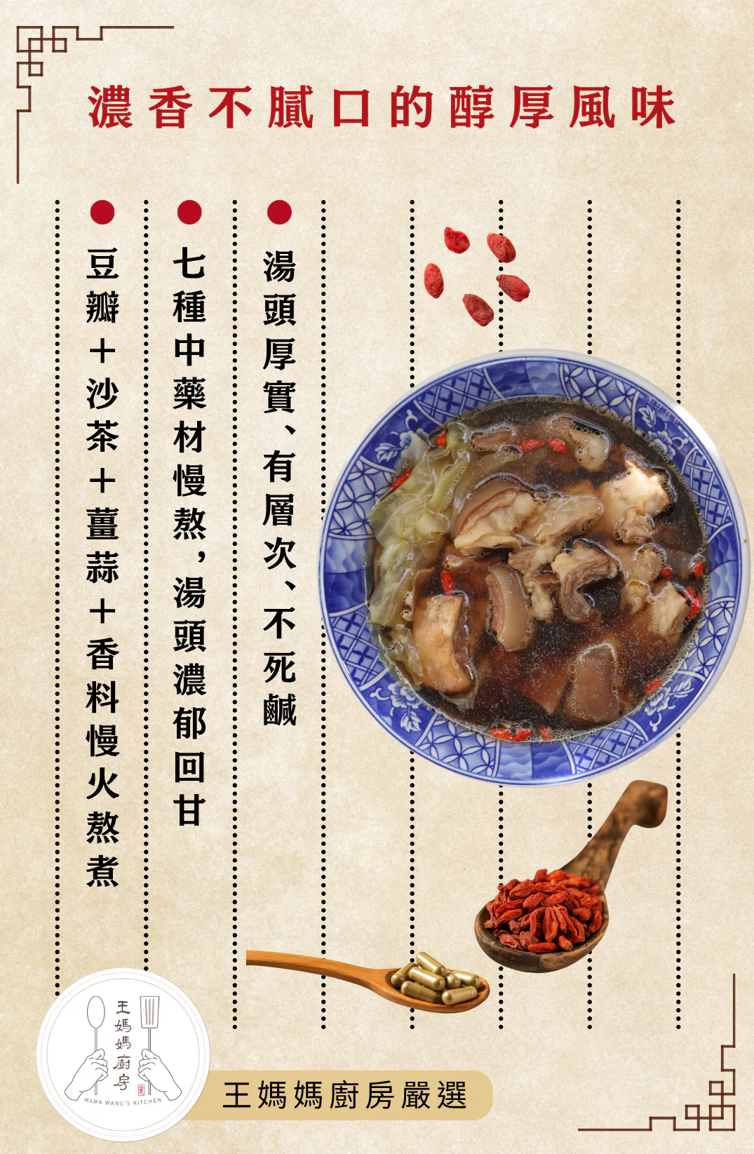 【成份】水、羊肉、豆瓣醬【紅辣椒、水、非基因改造黃豆、食鹽、甘蔗液糖(糖、水)、蠶豆、香油(大豆油、芝麻)、麵粉、調味劑(5′-次黃嘌呤核苷磷酸二鈉、5′-鳥嘌呤核苷磷酸二鈉)、八角粉】、洋蔥、醬油、米酒、雞粉【鹽、麥芽糊精、L-麩酸鈉、糖、玉米澱粉、雞肉粉、香料、酵母萃取物(酵母萃取物、鹽)、雞油、棕櫚油(棕櫚油、硬質棕櫚油)、調味劑(5′-次黃嘌呤核苷磷酸二鈉、5′-鳥嘌呤核苷磷酸二鈉)、白胡椒】、沙茶醬【大豆沙拉油、小麥麩皮、南薑粉、大豆蛋白(非基因改造)、蒜頭、蔥乾、芝麻、L-麩酸鈉、純釀造黃豆醬油、魚乾、食鹽、百草粉(麥芽糊精、眾香子、茴香抽出物、小麥纖維、丁香抽出物、肉桂抽出物)、辣椒粉、5′-次黃嘌呤核苷磷酸二鈉、5′-鳥嘌呤核苷磷酸二鈉】、蔗糖、薑、小茴香籽、蒜、調味劑(L-麩酸鈉、5′-次黃嘌呤核苷磷酸二鈉、5′-鳥嘌呤核苷磷酸二鈉)、肉桂、八角粒、甘草、蔥