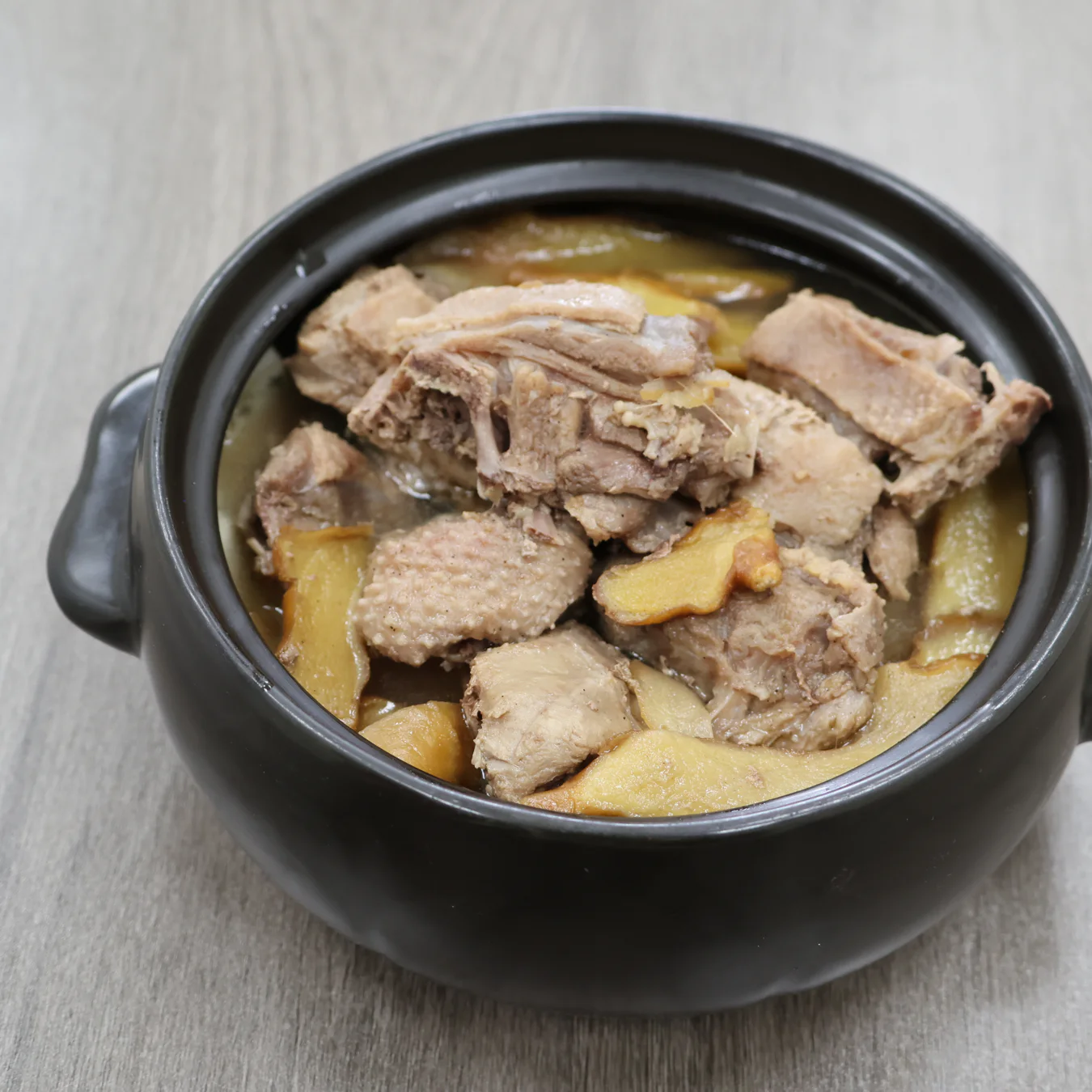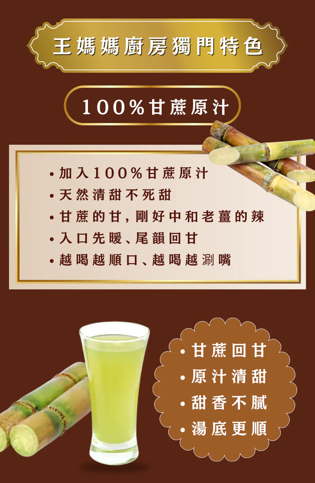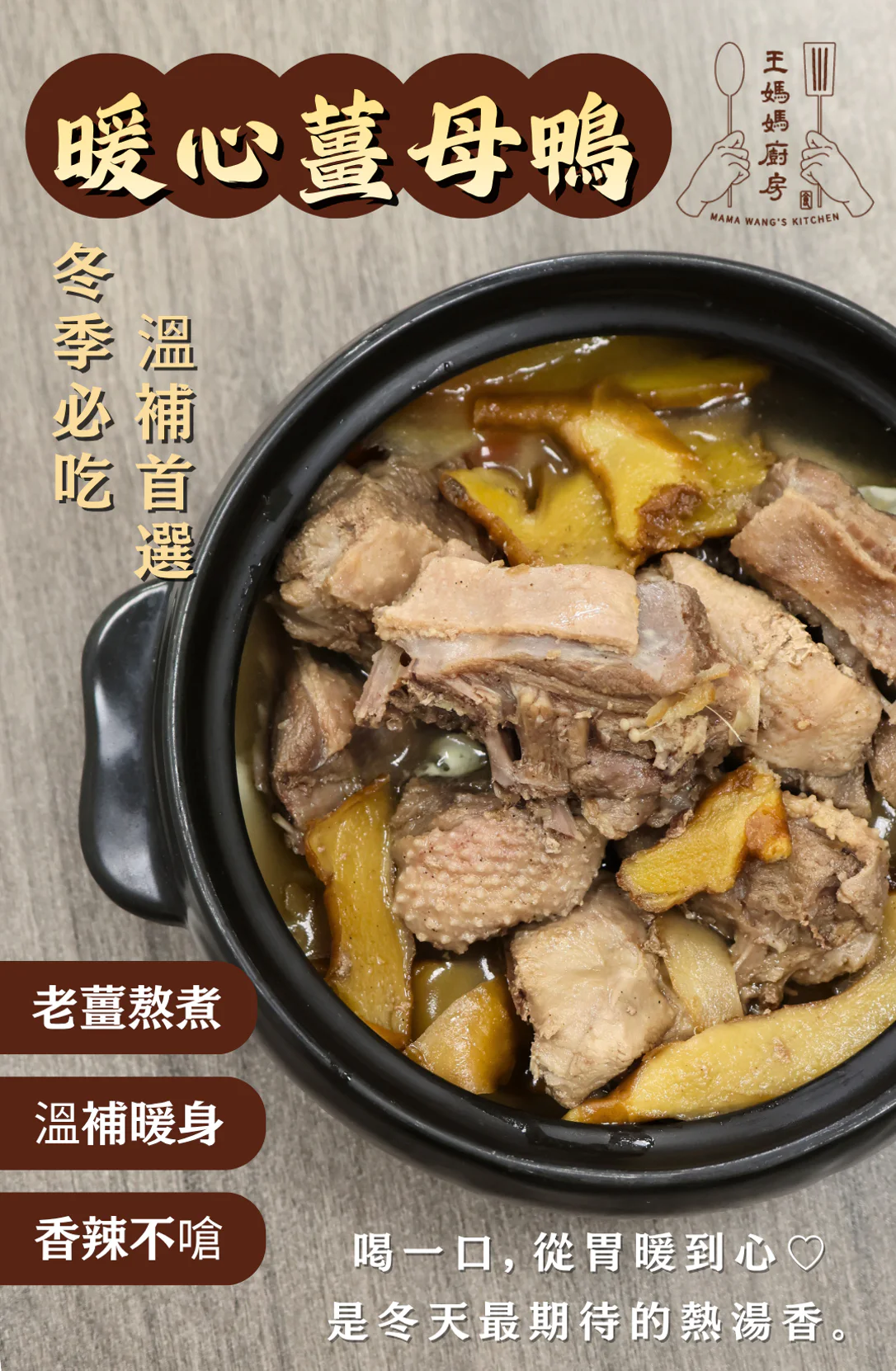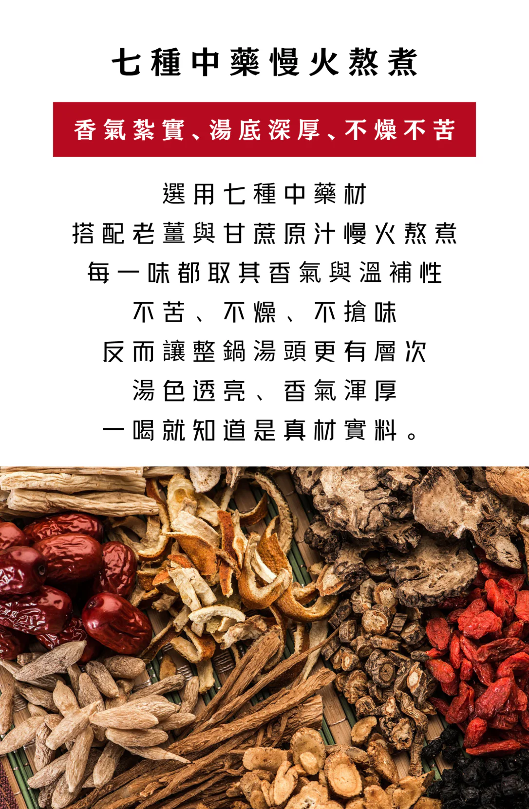 台灣本土鴨肉結實彈性佳。老薑爆香帶出辛辣溫暖,搭配 100% 甘蔗原汁增添甘甜,再以七種中藥材慢熬,湯頭濃郁回甘、越煮越暖身。